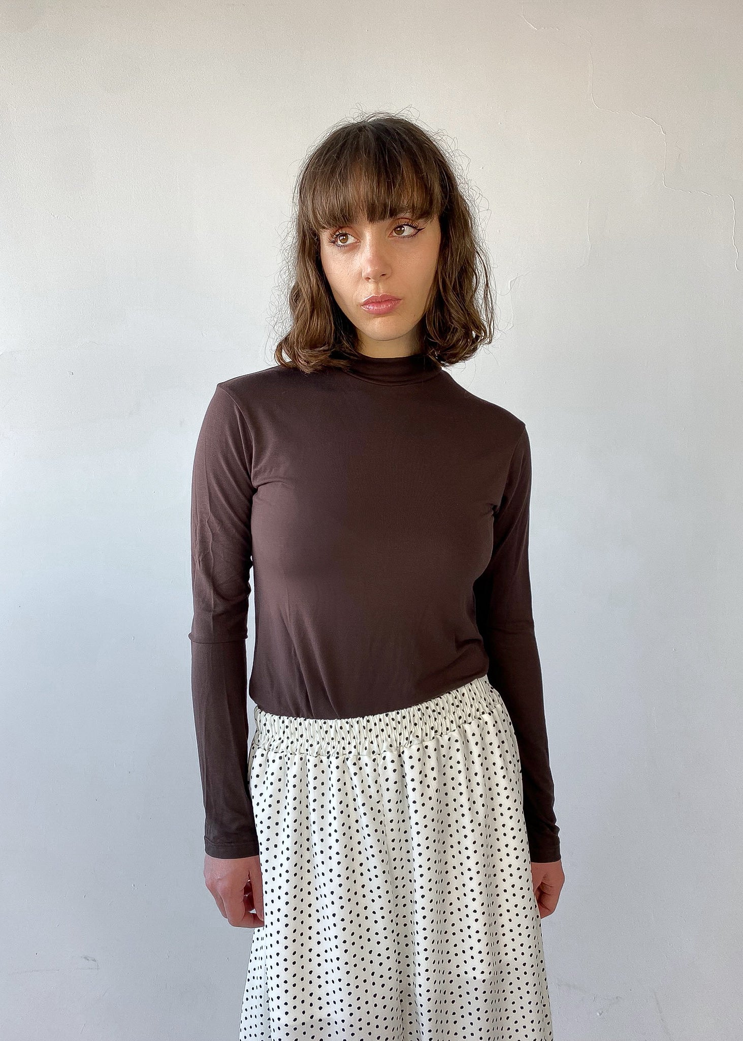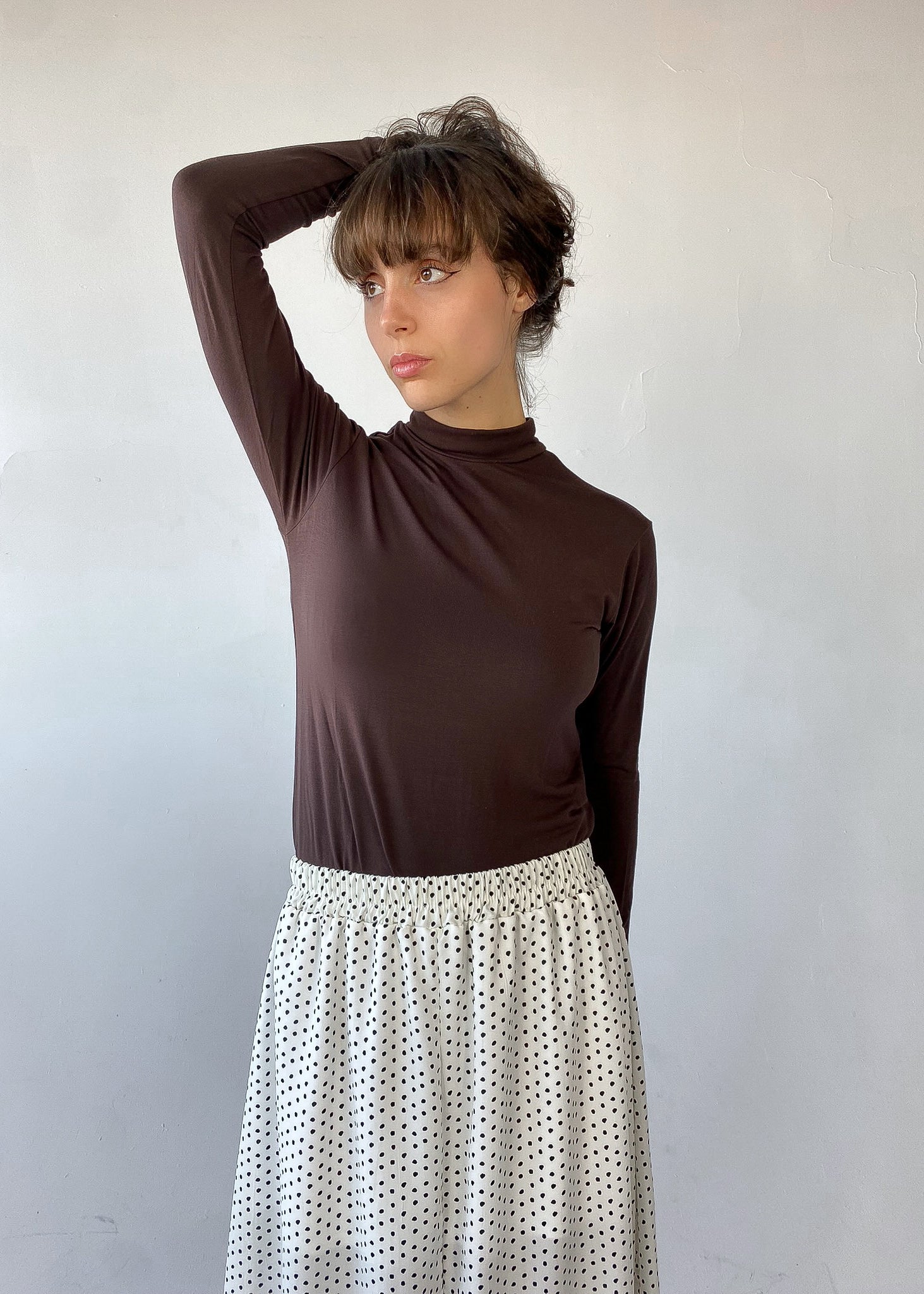 Col roulé en bambou brun foncé. Confectionné dans un tissu ultra-doux et respirant, ce col montant offre une coupe ajustée et un confort optimal. Idéal pour un style épuré et intemporel.
