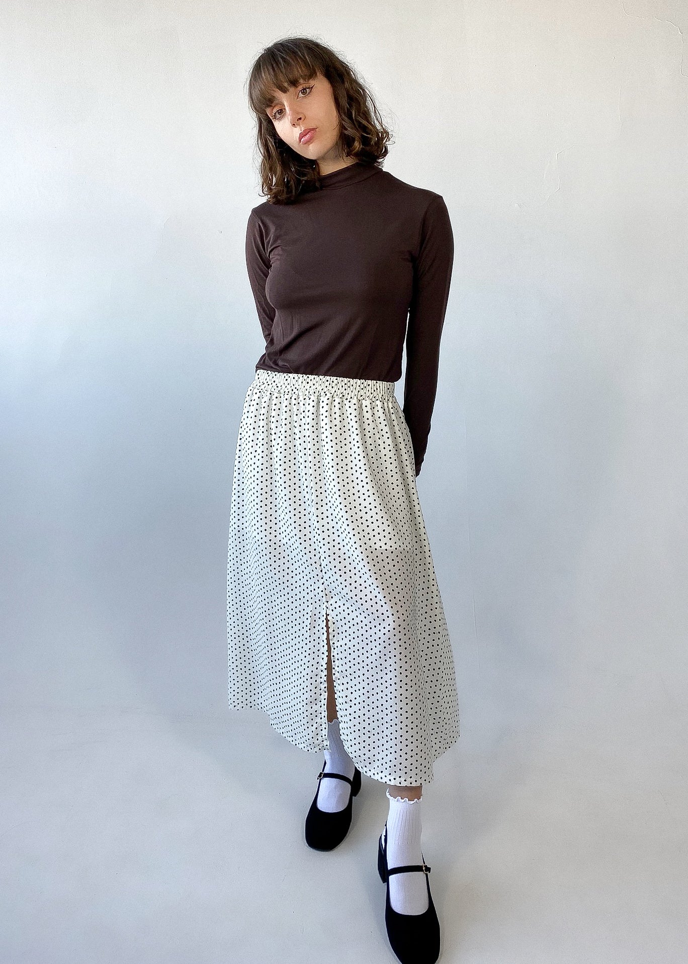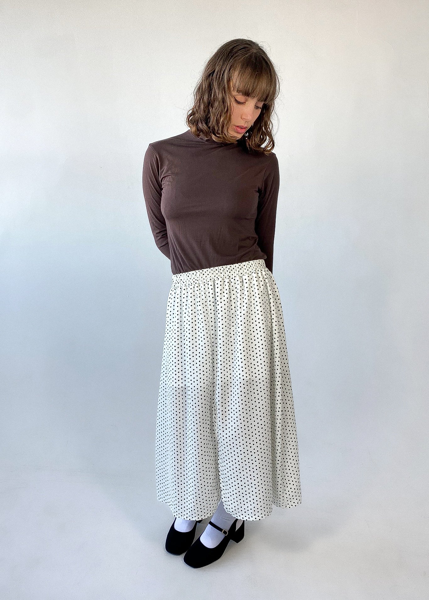 Jupe midi à pois dotée d’une taille élastique et d’une fente avant subtile pour une allure féminine et fluide. Conçue avec une doublure en tricot de bambou ultra-confortable, elle allie élégance et douceur au quotidien.